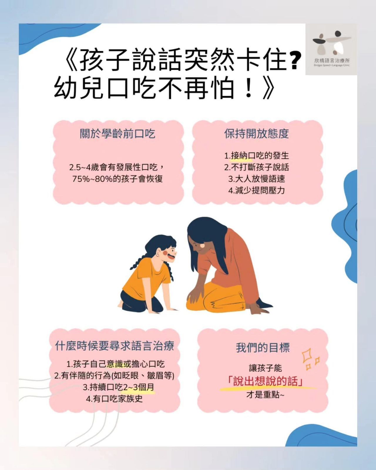 若孩子持續口吃,家長也不用太過擔心,口吃並不會定義您的孩子,您的耐心和接納,讓孩子能「說出想說的話」,才是幫助孩子建立溝通信心的最大基石。